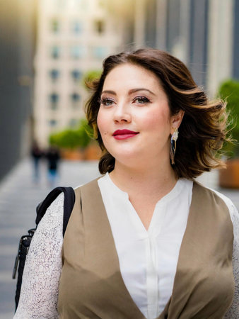A young plus size woman radiates joy while exploring outdoors on a beautiful autumn day dressed impeccably.