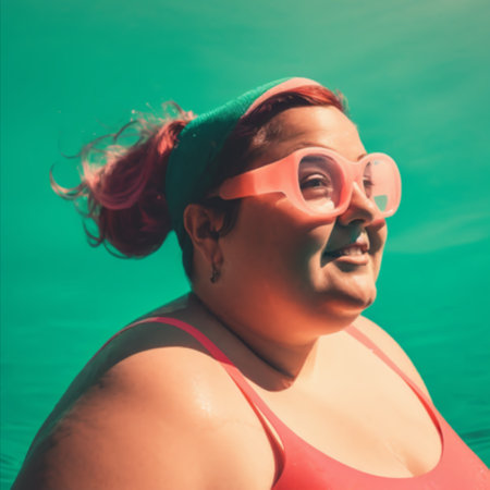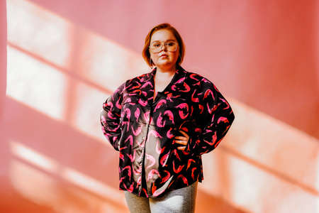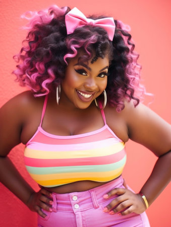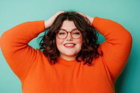 Joyful plus-size woman wearing stylish glasses, posing against vibrant backdrop, embracing self-love and celebrating individuality.