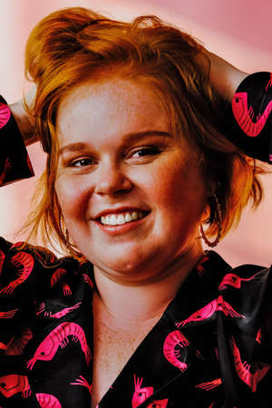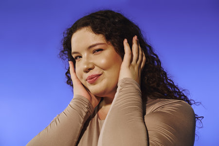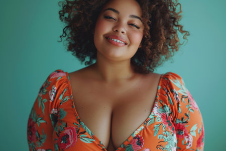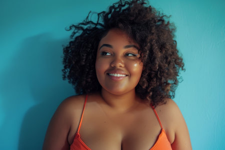 A confident plus size woman smiles playfully, embracing her beauty in a vibrant setting.