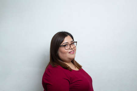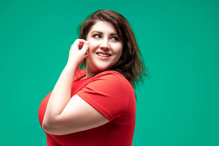 Happy plus size fashion model in red blouse on green background, body positive concept
