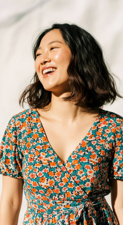 Female with shoulder-length hair, dressed in a colorful floral dress, smiles brightly against a soft background, conveying joy and warmth in a cheerful setting, AI generated