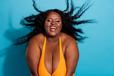 Portrait of attractive overjoyed cheerful thick brunet woman having fun curls flying isolated over bright blue color background