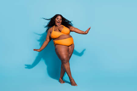 Lucky plus-size lady overweight woman in fashion orange dress happy dancing, celebrating on yellow background with free text space
