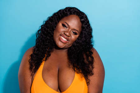 Portrait of attractive cheerful cute fat nude woman posing wearing big size isolated over bright blue color background