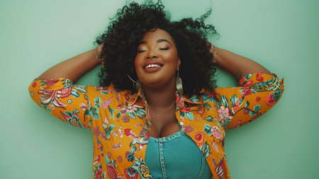 A plus size woman with curly hair, wearing a floral shirt, smiles brightly as she lies on her back against a green wall.