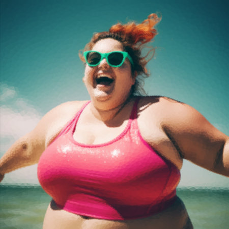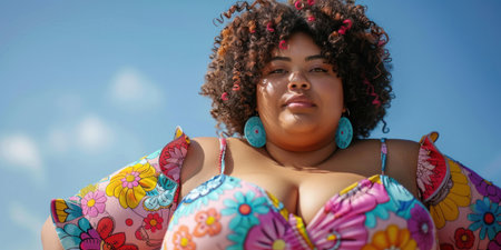 A confident plus-size woman stands on the beach, embracing her curves while wearing a vibrant summer dress. The sun shines brightly, illuminating her joyful presence and colorful outfit.