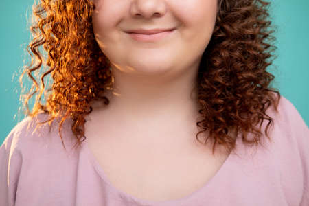 Pretty smiling woman. Body positive. Curly hair treatment. Modern trend. Model shooting. Happy plus size lady isolated mint green cropped head.