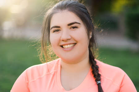 Overweight woman. Imperfect body. Plus size beauty. Happy lifestyle. Portrait of cheerful young obese plus size lady smiling outdoors in defocused green park landscape.