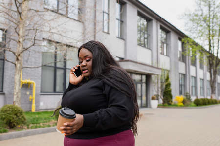 cheerful african american plus size woman holding notebook and speaking on smartphone outside