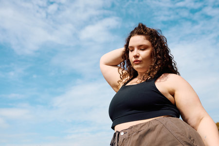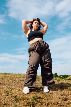 A confident plus size woman stands gracefully in a lush, open field, basking in the sunlight.