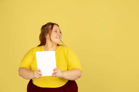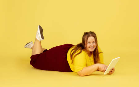 Using tablet. Beautiful plump caucasian plus size model isolated on yellow studio background. Concept of inclusion, human emotions, facial expression, sales, body positive. Copyspace for ad.