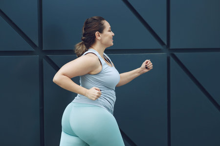 Fat woman jogging, doing sports for weight loss, obesity problem. High quality photo.