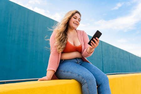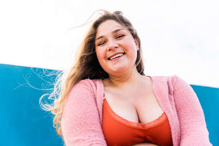 Beautiful and cheerful plus size young woman outdoors - Pretty overweight curvy female, concepts about femininity, women power, female emancipation, body positivity and body acceptance