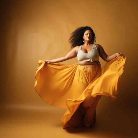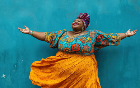 A plus-size woman dances energetically, wearing a colorful top and flowing orange skirt. She is smiling broadly, expressing happiness, with a vivid blue wall enhancing the vibrant atmosphere.