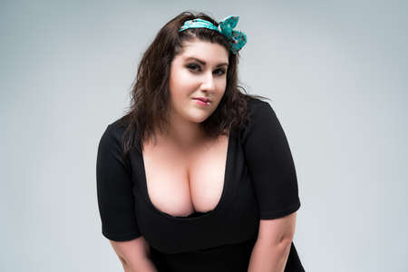Sexy plus size fashion model in black blouse with deep neckline, fat woman on gray studio background, body positive concept