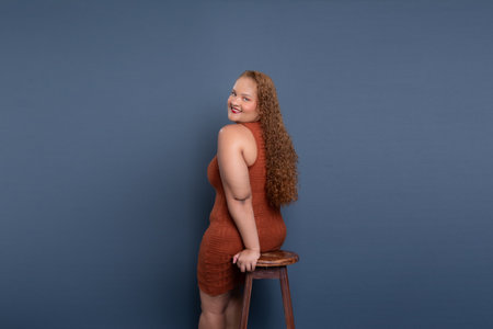 Beautiful woman with brown curly hair standing leaning on a wooden stool posing for the camera isolated on gray background. Confident person.