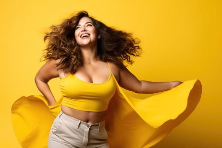 Fashionable curvy woman wearing matching yellow ensemble strikes confident pose against bright orange background, showcasing body-positive attitude and contemporary plus-size style.