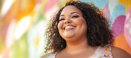 Confident plus-size woman in a bright floral dress, posing against a colorful graffiti wall. Embracing body positivity, self-love, and vibrant urban culture.
