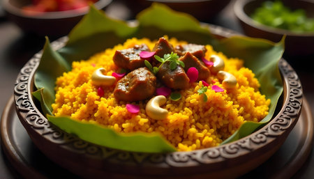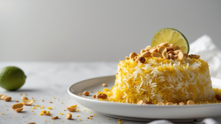 AI Generated. Delicious Turmeric Rice with Peanuts and Lime Garnish