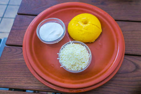 Moldavian Traditional Mamaliga Shredded Cheese and Sour Cream Dip on a Red Colored Ceramic Plate