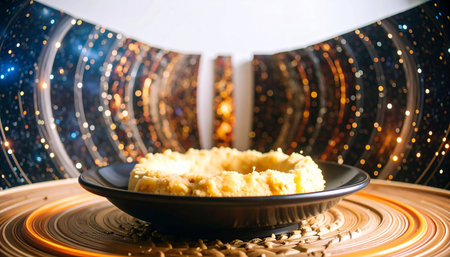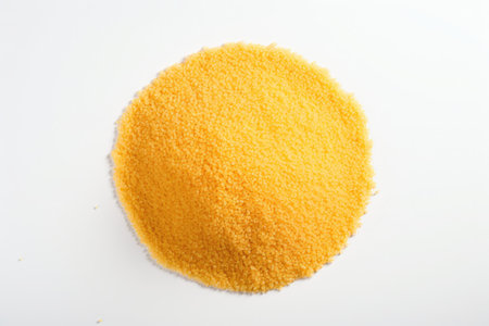 Vibrant semolina levitates mound capturing textural details and fine particles dark backdrop. striking contrast emphasizes unique shapes.