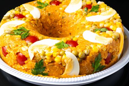 Traditional russian salad Mimosa with vegetables and fish. Layered salad with potatoes, tuna, carrot, onion, eggs and mayonnaise.