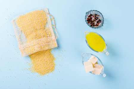 Ingredients cook Kus-Kus on a blue background. Broth, Broth, Butter.Top View Copy space for Text.Flat Lay .Food or Healthy diet concept.