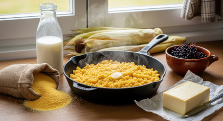 Traditional rustic cornmeal mush steaming in a cast iron skillet. A classic homemade breakfast with butter milk and fresh corn.