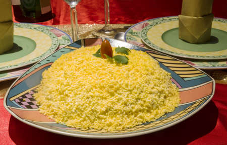 Couscous in a metal saucer on the traditional cloth. Selective focus.