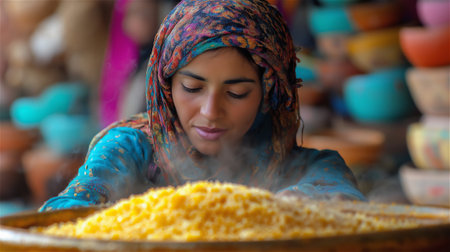 Close-up of Amazigh women preparing couscous, with traditional pottery and vibrant colors in the background, Amazigh New Year in Morocco.