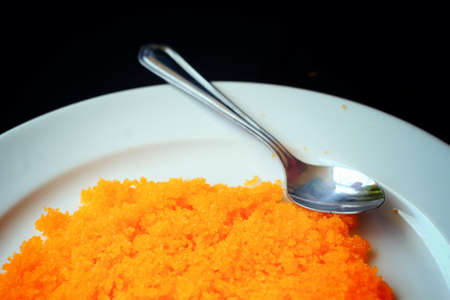 A vibrant mound of finely grated yellow dessert decoration is prominently displayed in a traditional bowl showcasing its texture and color.