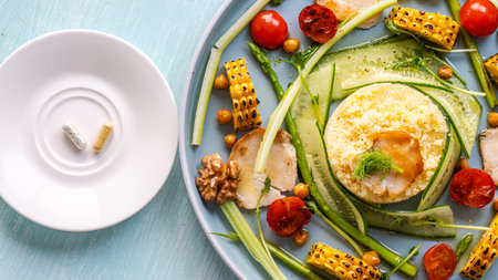 A plate with delicious and healthy food: couscous with vegetables and a plate with pills. Concept: Pills or healthy food. High quality photo