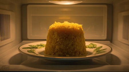 Single-serving meal rotating on microwave plate with warm yellow interior light