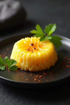 The dish showcases bright yellow couscous artfully arranged in a ring, garnished with cherry tomatoes and herbs, complemented by rich sauces on a dark plate.