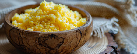 A close-up of corn grits in a wooden bowl, placed on a rustic tablecloth.