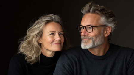 A retired couple sits close together in a warm, inviting environment.