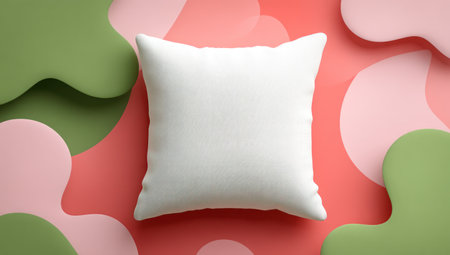 A square white pillow sits against a backdrop of organic shapes in pink, green, and coral. The image features soft lighting and a flat lay composition. This versatile visual is suitable for product mockups and design presentations. It is appropriate for various commercial applications.