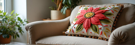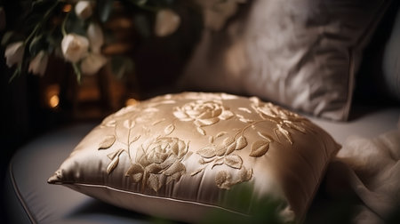 Decorative embroidered cushion with floral pattern