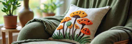 Cozy green armchair with embroidered mushroom pillow and indoor plants. That the image is generated using AI.