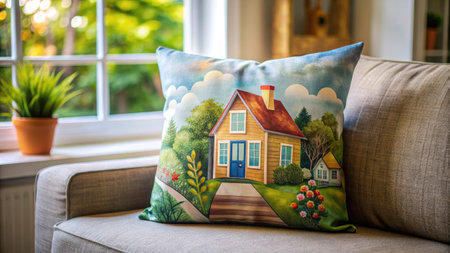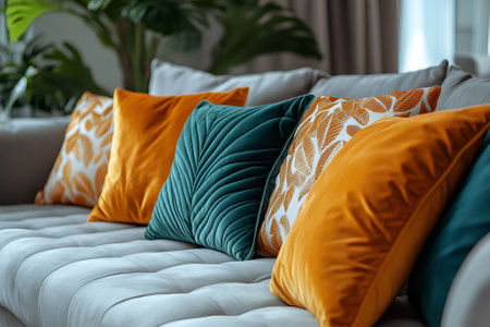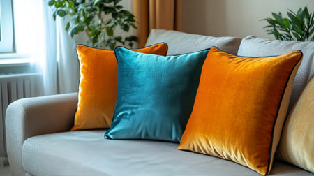 vibrant throw pillows on a comfy couch, creating a cozy home ambiance with space for text