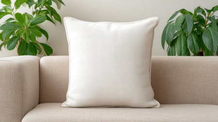 A soft white pillow rests on a light beige sofa, creating a cozy and inviting atmosphere in this minimalist living room setting. A natural plant enhances the decor.