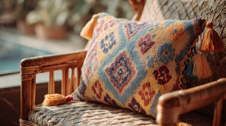 Decorative woven pillow rests on a rustic chair in a warm, sunlit indoor space with plants in the background
