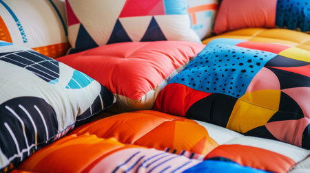 The bed is covered with inflatable throw pillows featuring bold geometric patterns in vibrant colors