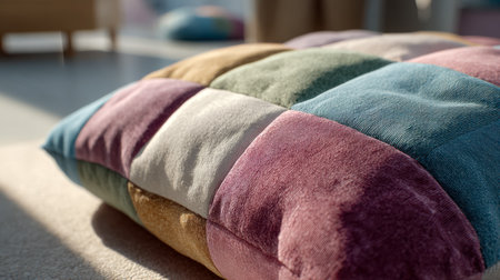 Sunlit close-up of a vibrant velvet patchwork cushion showcasing rich hues and intricate stitching, evoking warmth and cozy elegance in a relaxed setting.