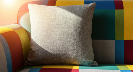 Clean, blank pillow resting on a fabric couch with geometric cushions, surrounded by sunlight and simple decor