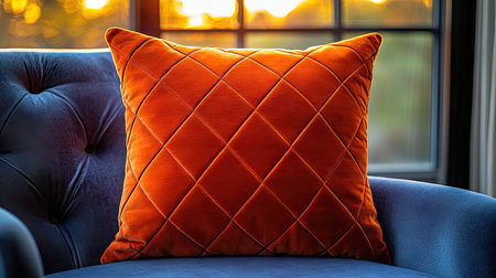 Close-up of an orange cushion with a diamond pattern on a blue armchair in front of a window at sunset, home interior design photography. --chaos 30 --ar 16:9 --stylize 750 --v 6.1 Job ID: c75cfad4-0424-4a73-9f2f-67c5e22fa04b