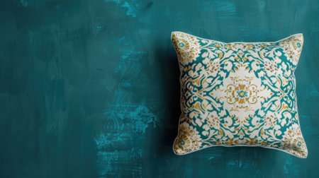 Ornate pillow with teal and gold patterns against painted wall