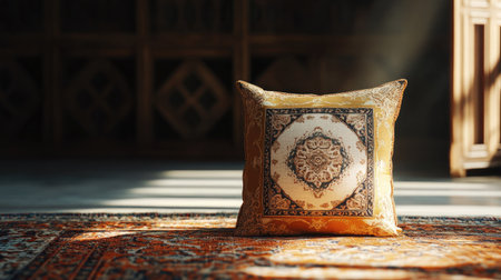 A beautiful decorative pillow with intricate patterns rests on a rustic floor, bathed in warm light, adding an elegant touch to interior decor.