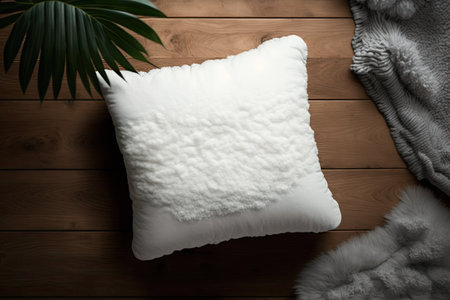 On the hardwood surface there is a white pillow and a fluffy soft rug. from the top looking down. as a mockup