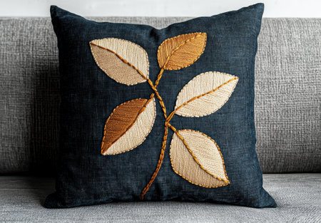 Decorative throw pillow with embroidered leaf design.